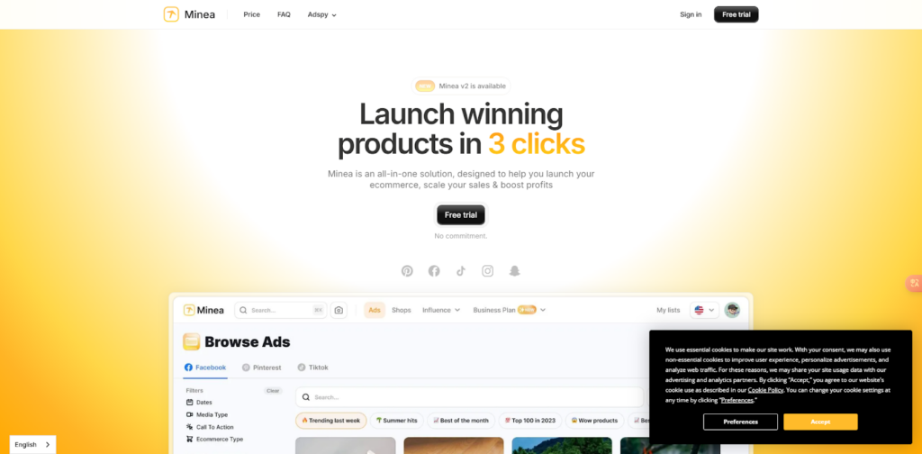 Minea secures its place as one of the top tools due to its inclusive set of features that analyze ads across different platforms while also providing influencer research capabilities. With advanced AI-powered technology, Minea scans TikTok alongside Facebook and Instagram ads.