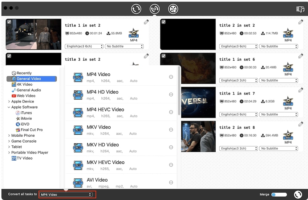 Click the “Convert all tasks to” pop-up menu to select an output format, MP4 and MOV are highly compatible options for Mac.