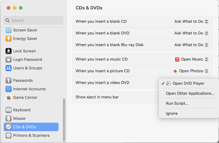 First, make sure you have an optical drive connected to your Mac, then open the System Settings from Apple menu, and click “CD & DVDs” in the sidebar. Click the drop-down icon of “When you insert a video DVD”, and choose “Open DVD Player”, “Ignore”, or “Open Another Application” depending on your needs. Note that you’ll need to restart the computer for the settings to take effect.