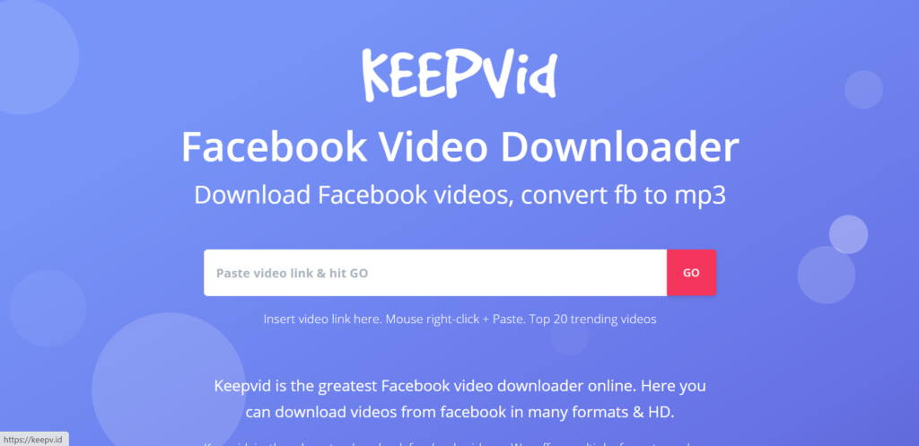 Keepvid is the place to download Facebook videos. Keepvid offers multiple formats and can convert your FB video to MP3. If you need a Facebook video downloader, keepvid is one of the best solutions.