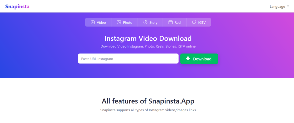 Snapinsta is not only an Instagram video downloader, you can download Instagram photos, Instagram stories and Instagram reels. You can download videos, and images in high quality.