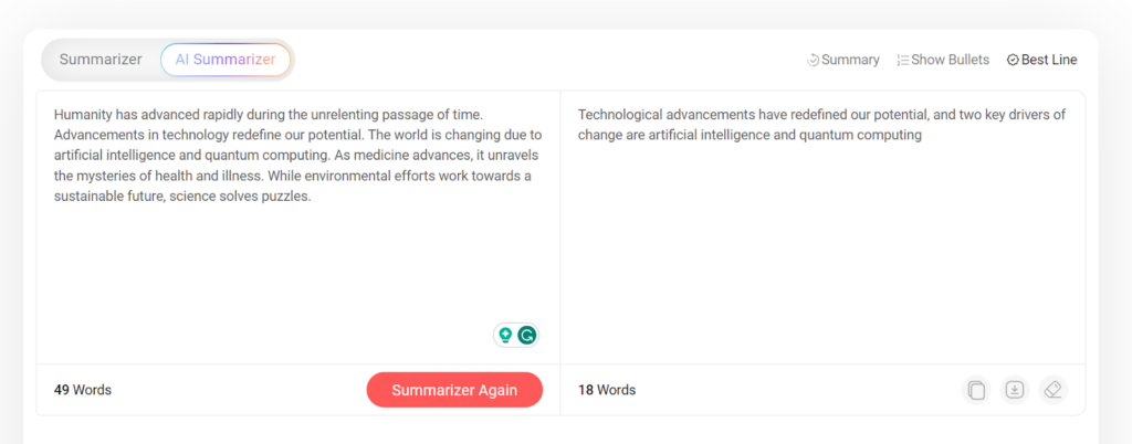 But, if you are unable to enclose your message in a concise and brief manner, you can get help from an online summarizer. It is effective at encapsulating the long-form text into very short form. It uses artificial intelligence to immediately summarize content pieces accurately.