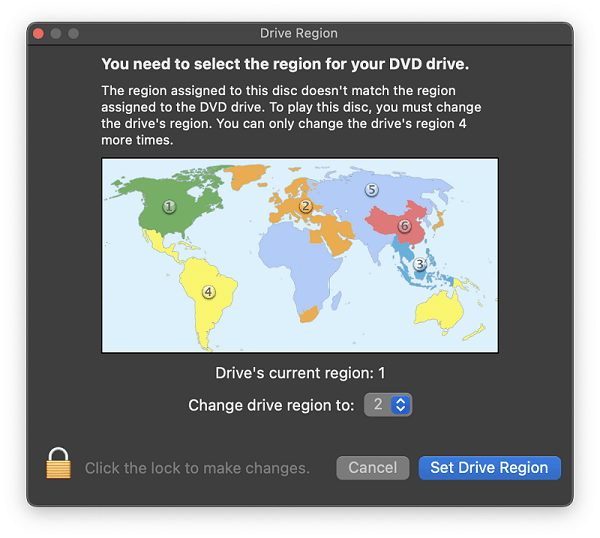 If you insert a DVD that doesn’t match your Mac DVD drive’s region code, e.g., a region 2 DVD from Japan, you must change the drive’s region in order to play it. Note that you can only set the DVD drive region 5 times. If you reach the maximum DVD region change limit, DVDs that don’t have a compatible region code will be ejected.